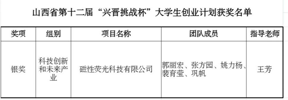 9月8日至9日,由共青团山西省委、山西省教育厅、山西省科学技术协会、山西省学生联合会共同主办的山西省第十二届“兴晋挑战杯”大学生创业计划竞赛终审决赛在太原理工大学明向校区举行。按照常态化疫情防控要求,活动首次实现“云端”办赛,通过“云端”完成作品提交、文本评审与项目答辩,采用线上平台与线下项目报送相结合的方式进行。我们“磁性荧光科技有限公司”作品荣获科技创新和未来产业组银奖,在省赛舞台上为我们赢得了掌声与荣誉。