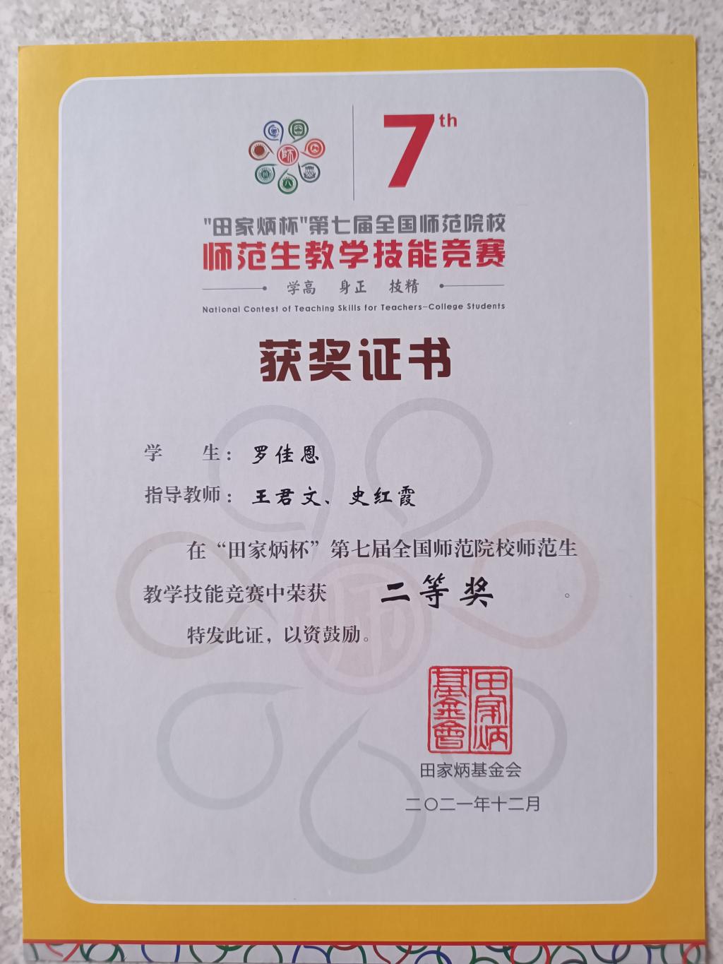 罗佳恩同学在王君文老师和史红霞老师的悉心指导下,取得二等奖的好成绩,充分展示了我们师范生培养成效。