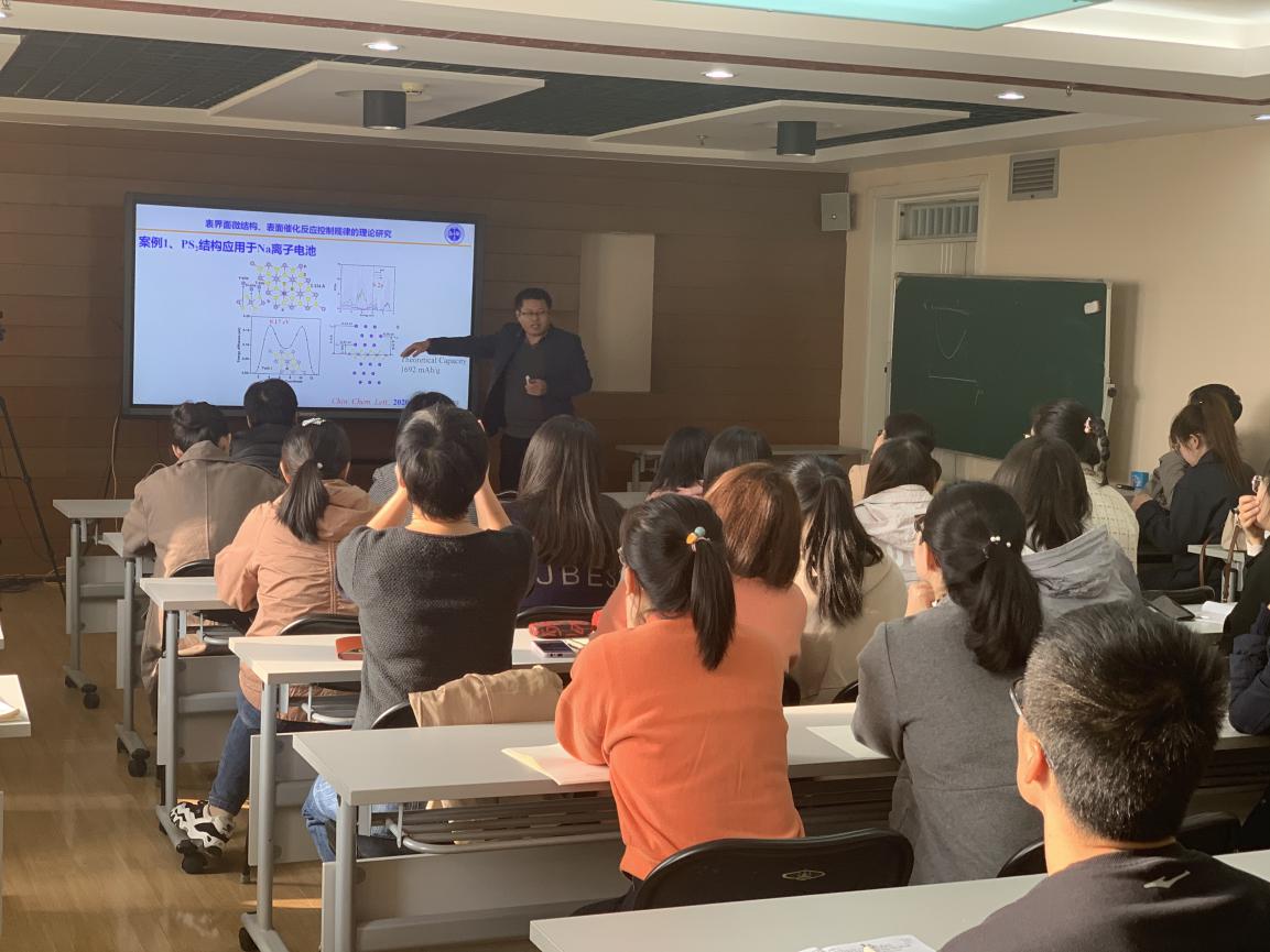 贾院长首先对报告人及报告内容作了简要介绍,并对何朝政教授的到来表示热烈欢迎。随后,何朝政教授主要从微观动力学模型,将其广泛应用于非均相催化体系。在DFT计算的基础上,通过构建微观动力学模型,能够解释实验上不同温度和压力下的产物选择性,并能够预测极端条件下产物的分支比信息。该方法突破了传统上只能定性的分析不同基元反应之间的竞争关系。何教授还向大家展示了以CO氧化为目标反应,设计二维催化材料。在原子尺度理解单原子与载体的相互作用,揭示单原子催化的优良催化性能,并与在场师生进行了互动交流,对大家提出的问题一一进行解答。