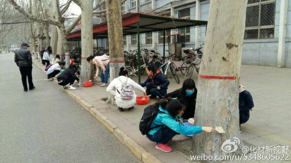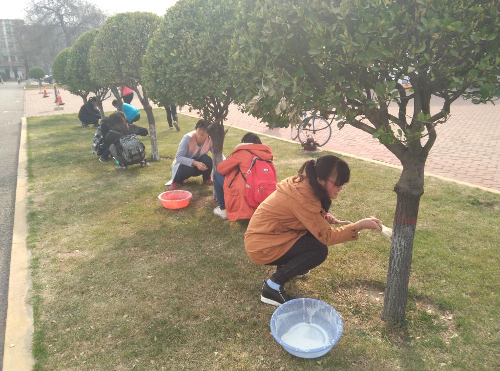 在听完活动安排之后,我们学生便拿起木刷,拎起装满白漆的红桶,两俩一组给自己所划区域的每棵树木根部都涂上了厚厚的一层保护漆,以防止害虫叮咬,并起到御寒保暖的作用。活动现场,同学们你提桶、我刷漆,互相配合,干得热火朝天,通过自己的劳动,让我们的校园绿化更加美好,让我们生活的环境更加怡人。