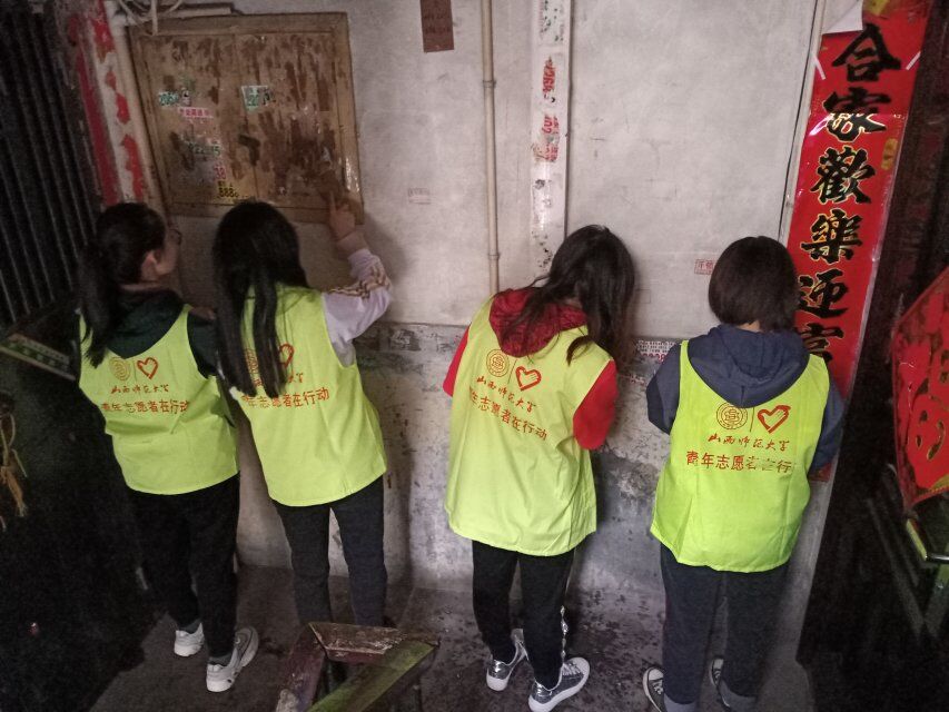 参加志愿服务的同学们先在化学楼前集合,集体前往西平房取服务工具,到达学府社区31号楼后,负责人强调了服务期间的注意事项。服务期间,志愿者们认真劳动,先将粘在墙上、栏杆上的广告纸打湿,再细心地将它们一一铲除,然后将地上的碎屑打扫干净。