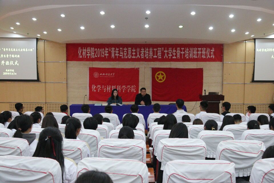 为热烈庆祝中华人民共和国成立70周年、五四运动100周年,深入学习贯彻党的十九大精神及习近平新时代中国特色社会主义思想,践行习近平总书记在全国教育大会上强调的在六个方面下功夫,全面开展“学习习近平总书记重要讲话,争做新时代青年马克思主义者”教育实践活动,同时强化学生干部在团学工作中的作用,更好地推进团学工作健康持续发展,我们决定举办2019年“青年马克思主义者培养工程”大学生骨干培训班。11月3日晚,我们在综合实验楼418室举办了2019年“青年马克思主义者培养工程”大学生骨干培训班开班仪式。院党委副书记王振锋老师、院团委书记樊鑫老师出席开班仪式,全体青马学员参加。