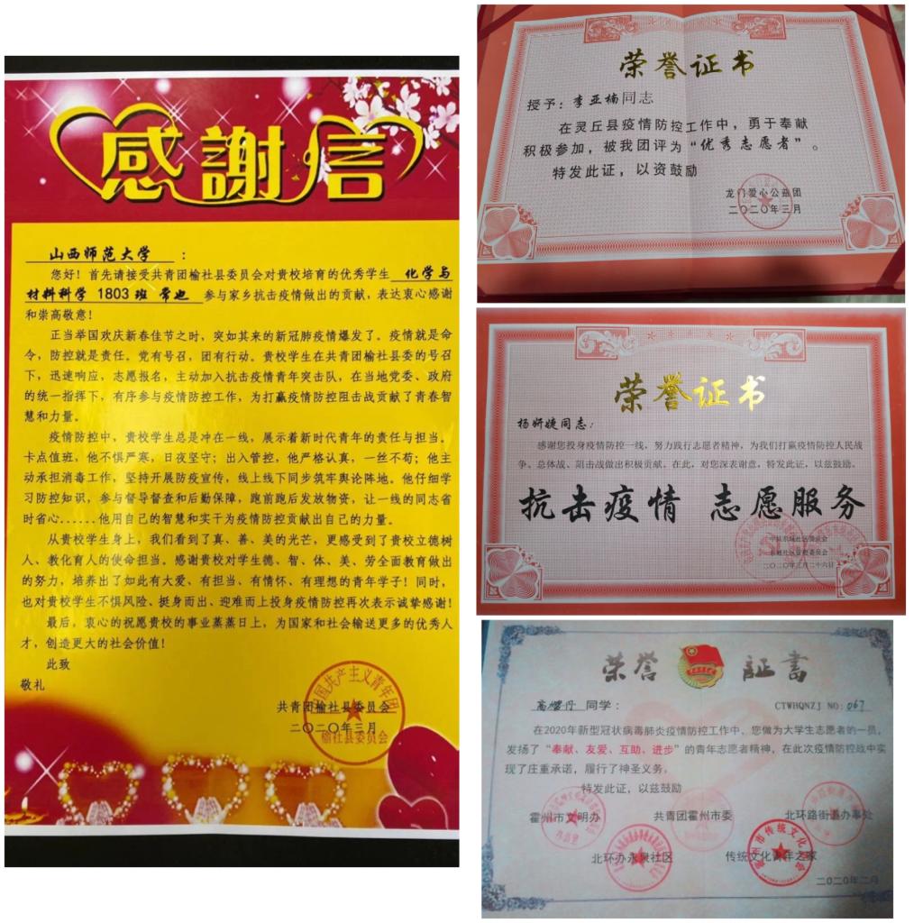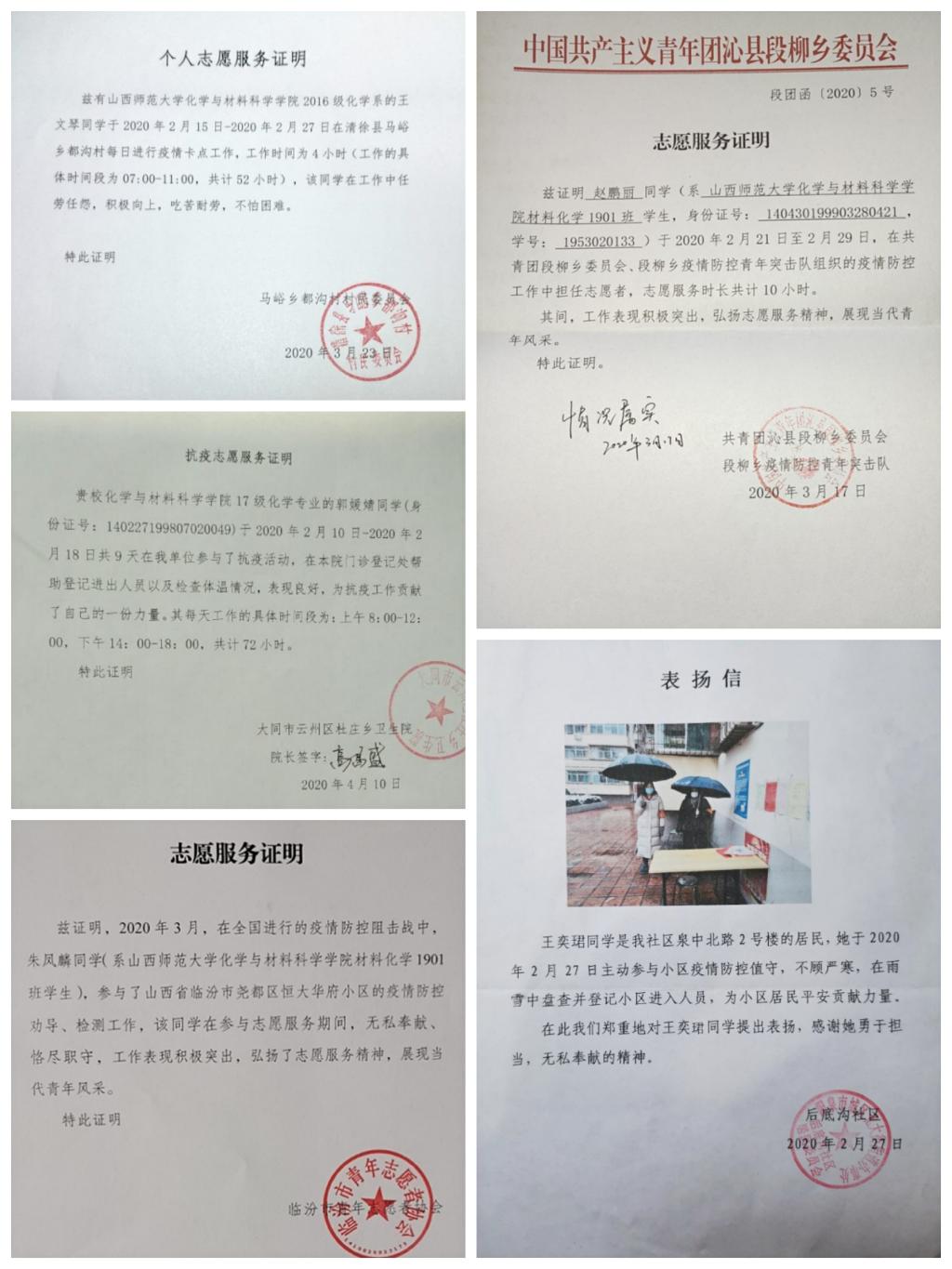我们共有78名学生担任防疫志愿者,他们在各自社区、村委会的领导下,有序参与了人员排查、巡逻防控、应急值守、消毒清洁、环境整治等工作,其中多名志愿者表现突出,受到了所在地政府、社区、村委会、基层党团委送来的感谢信以及嘉奖证明。