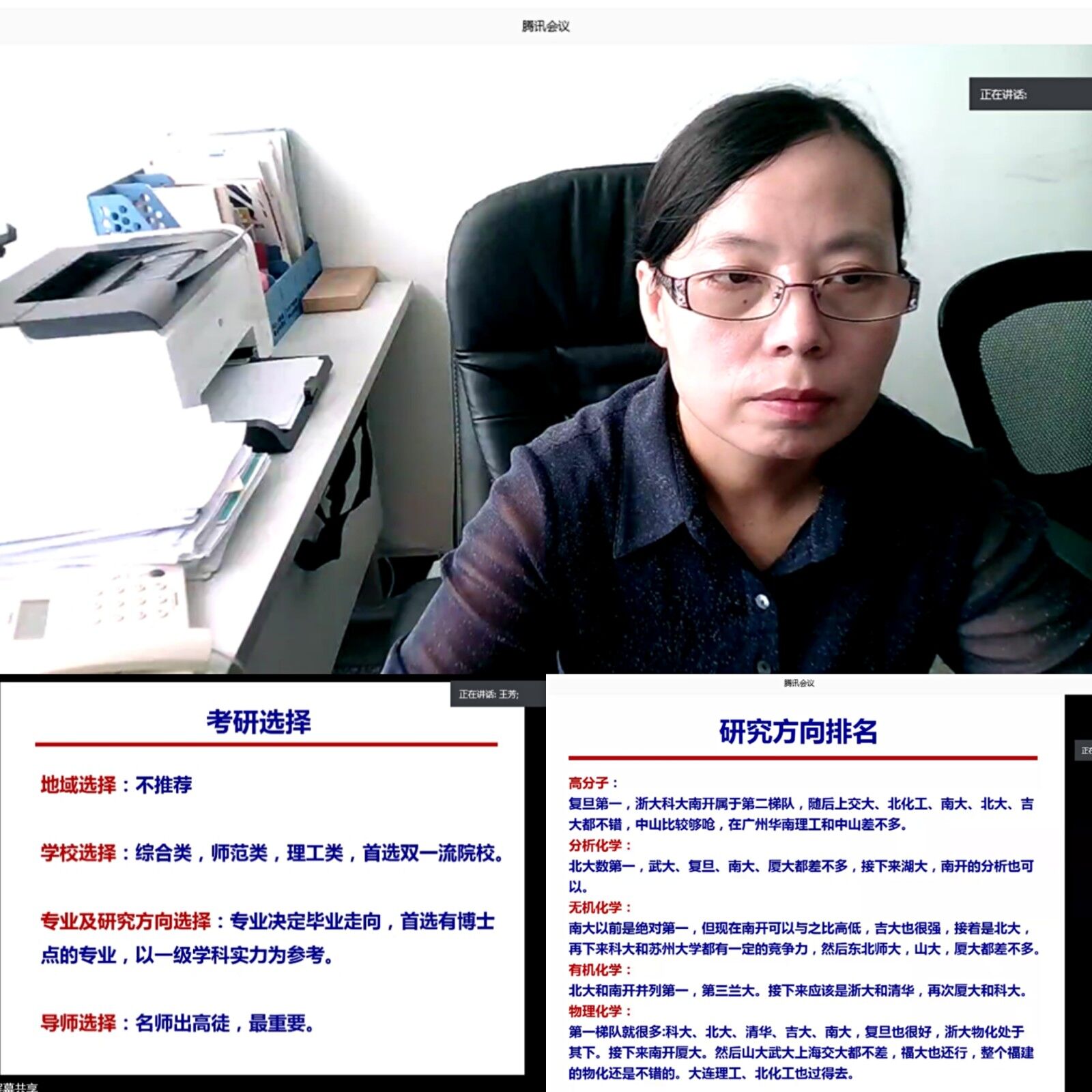 会上,王芳老师就有关毕业去向、择业等问题作出解答。针对如何正确选择考研方向,她围绕学校选择、专业选择、研究方向、导师选择等四方面作了讲解,同时以自身经历分享国外留学见闻,讲述出国留学的相关途径、政策及语言要求。结合学科特点,王芳老师详细介绍了我们的发展概况、师资力量、磁性分子与磁信息材料重点实验室发展特色等。最后,她希望同学们能够端正态度、明确目标,用信心、决心、恒心以及平常心积极面对考研。