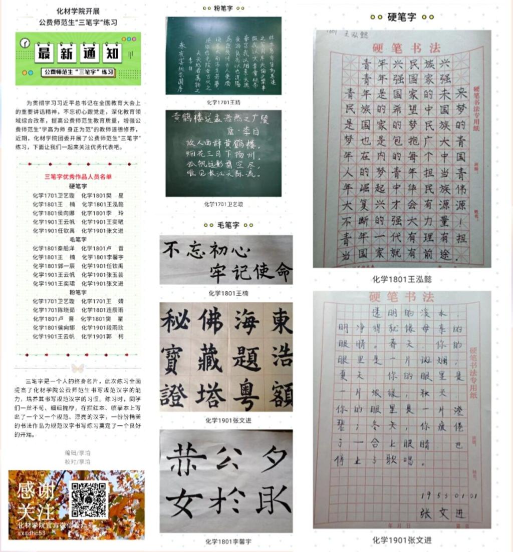 三笔字书写是教师传承优秀传统文化、传授知识信息、传播审美观念、塑造自身形象的重要载体。自2019年9月以来,我们团委在公费师范生中开展三笔字书写技能培训活动,采取个人练习与专家讲座相结合的方式,由专业书法人员定期对作品进行点评,并评选出优秀作品在公众号展示。截至目前,该项活动累计开展4次,微信推送4次,累计参与688人次,微信点赞量522人次,浏览量1503人次。作品展现了我们学子的书写风采,彰显了学子们对“持中秉正”师德的追求,同学们纷纷表示今后将加强三笔字练习,提高综合素质。