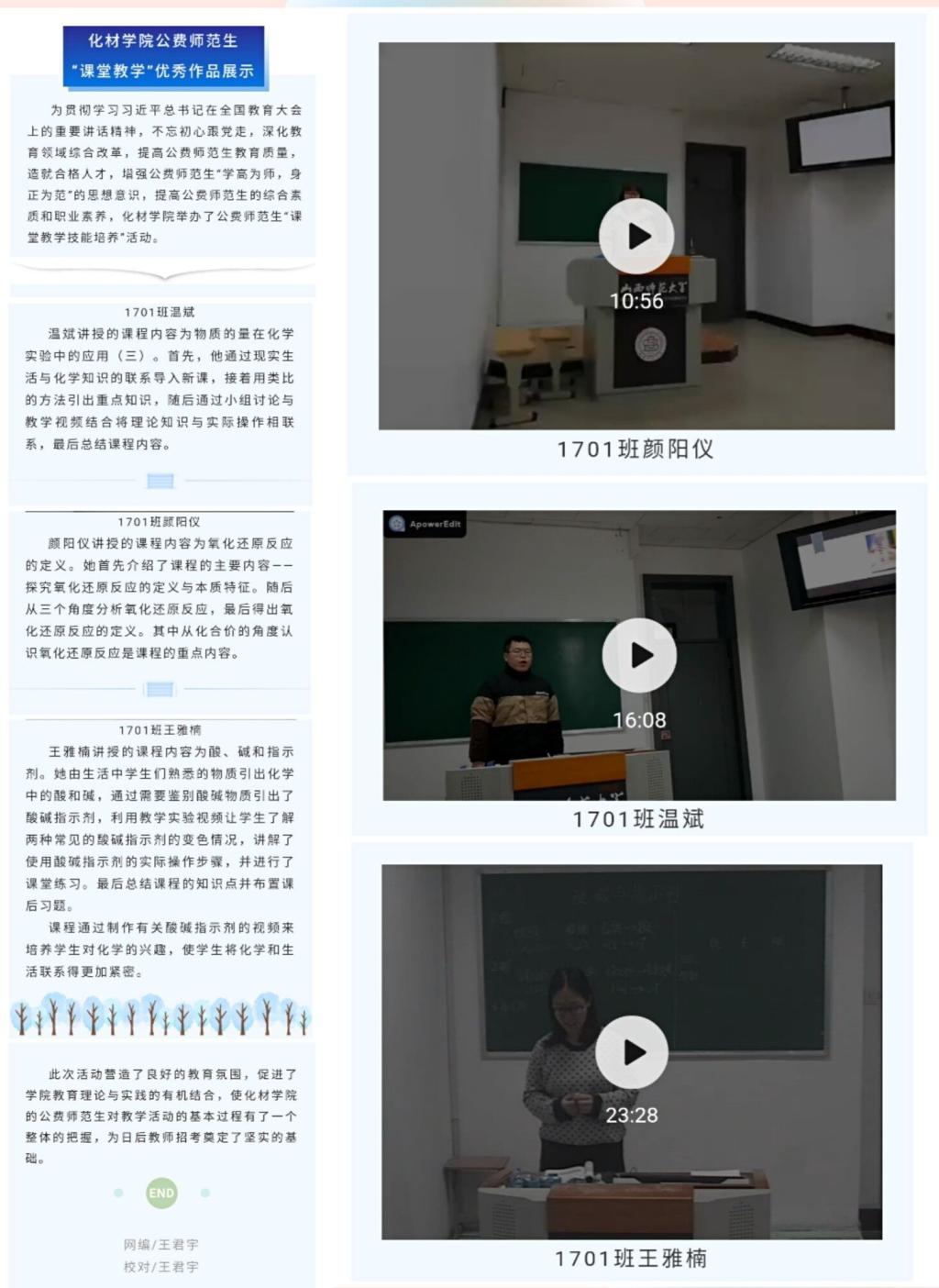 教学设计和课堂教学是教师教学技能的中心和重点。自3月份以来,院团委组织大二、大三公费师范生参与教学设计和课堂教学技能培养活动。每位同学自选初中或高中化学内容提前备课,并录制不少于5分钟的微课视频。PPT内容涵盖教学目标、教学重难点、教学方法、教学过程、教学反思等,契合主题,重点突出。截至目前,活动累计开展10次,微信推送10次,累计参与400余人次,微信点赞量1368人次,阅读量2683人次。