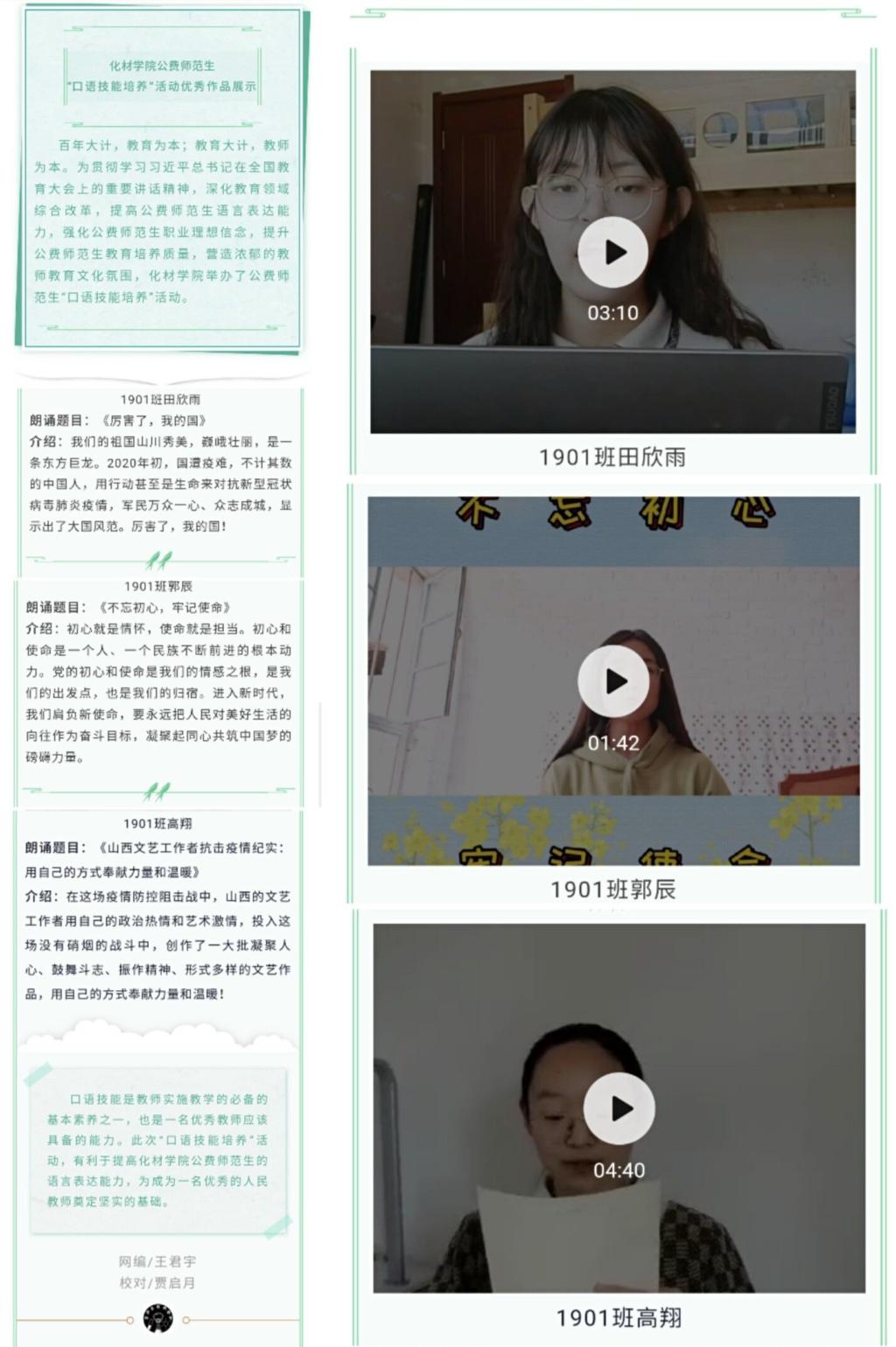 口语表达是教师传授知识和教育学生的主要手段。自今年3月份以来,我们团委组织大一公费师范生开展线上口语技能培训活动,每人录制不少于3分钟的朗诵视频,并配上50字左右的内容简介。作品以“众志成城抗疫情”、“学习五四讲话,勇担青春使命”、“我向祖国告白”为主题,致敬一线抗疫人员的甘于奉献和勇于担当,表达青年一代坚定理想信念、投身强国伟业的壮志。截至目前,该项活动累计开展14次,微信推送14次,累计参与600余人次,点赞量1558人次,阅读量3167人次。通过举办主题朗诵活动,一方面为公费师范生提供了展示自我、锻炼口语技能的平台,另一方面加强了爱国主义教育,引导他们坚定战“疫”信心、凝聚青春力量,勇担青春使命。