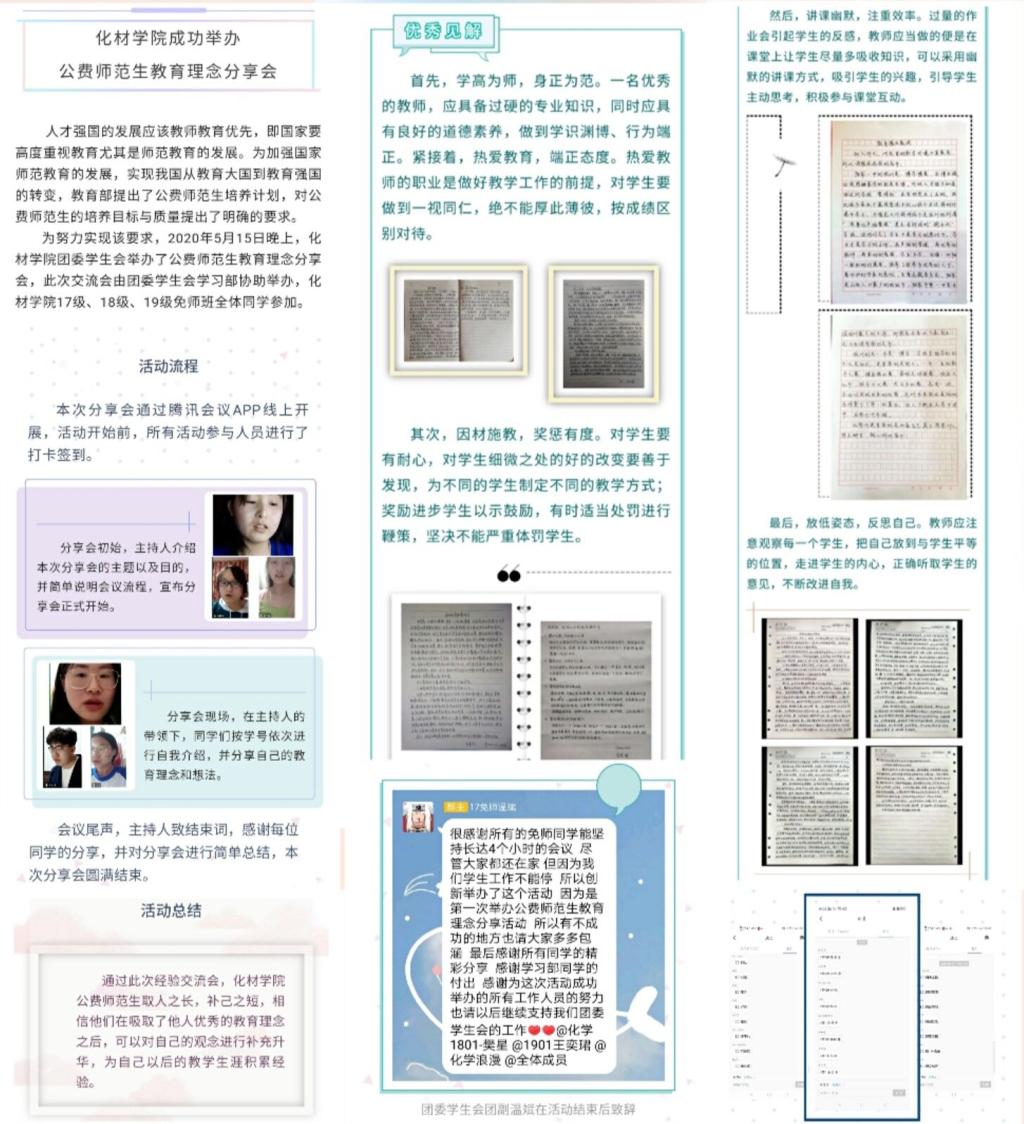 同时,为了给公费师范生搭建一个分享交流与实践创新的平台,5月15日,院团委举办公费师范生教育理念线上分享会,122名公费师范生参与。大家结合自身实践,引用名师事例,分享自身教育理念。通过探讨化学学科课堂教学方法与重难点,激发了教学热情,增强了职业认同感和责任感,大家纷纷表示要努力提升教学技能,为成为一名优秀的人民教师做好充足准备。