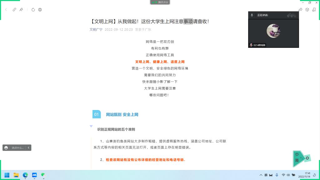 各团支部精心组织、认真部署,线上线下相结合,利用多种形式在集体内部宣传和普及网络安全教育的法律、法规政策和相关知识,强化全体同学对网络安全教育的参与意识和责任意识。化学2102团支部利用观看视频、播放PPT的形式向同学们直观地描述网络安全教育的重要性和维护网络安全的必要性,提醒同学们要提高网络安全意识,保障个人信息安全;材化2022团支部采用集体讨论的方式进行本次团日活动,团支书首先以答题的方式了解同学们对于网络安全知识的掌握度与理解度,随后邀请同学们积极分享个人见解、表达个人观点,巩固了同学们对网络安全知识的了解,让维护网络安全的理念深入人心。