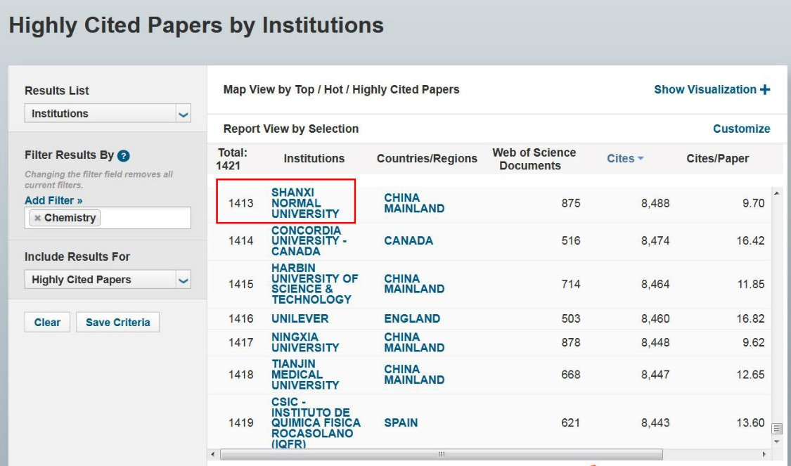 根据科睿唯安公司2021年5月13日发布的基本科学指标数据库(Essential Science Indicators,简称ESI)最新数据,我们化学学科(Chemistry)进入ESI全球排名前1%的学科,标志着该学科已进入国际高水平学科行列。