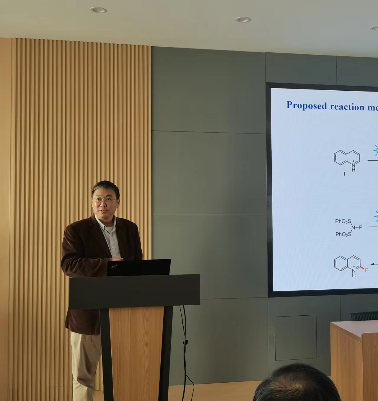 蔡琥教授的报告题目为“脱氢偶联构建C-C和C-X键的反应研究”。近年来,蔡琥教授通过构筑高反应活性胺类中间体,成功设计合成了系列喹喔啉类化合物、胺类化合物、α-咔啉类化合物等,其合成策略具有高度原子经济性以及底物普适性。在报告中,蔡教授深入浅出地介绍了合成策略的开发、反应机理的探究过程,让与会师生受益匪浅。
